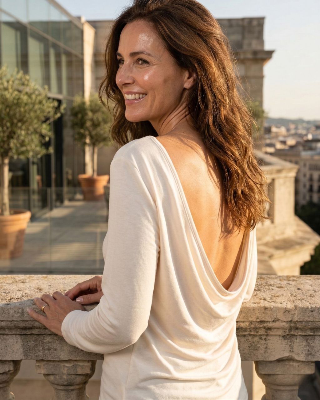 • Nieoczywisty urok. Z przodu postawiliśmy na elegancką prostotę i zabudowany dekolt w łódkę, by z tyłu zaskoczyć Cię efektownym, lejącym wycięciem. W odcieniu jasnego ecru ta bluzka natychmiast rozświetla i „robi” całą stylizację.
