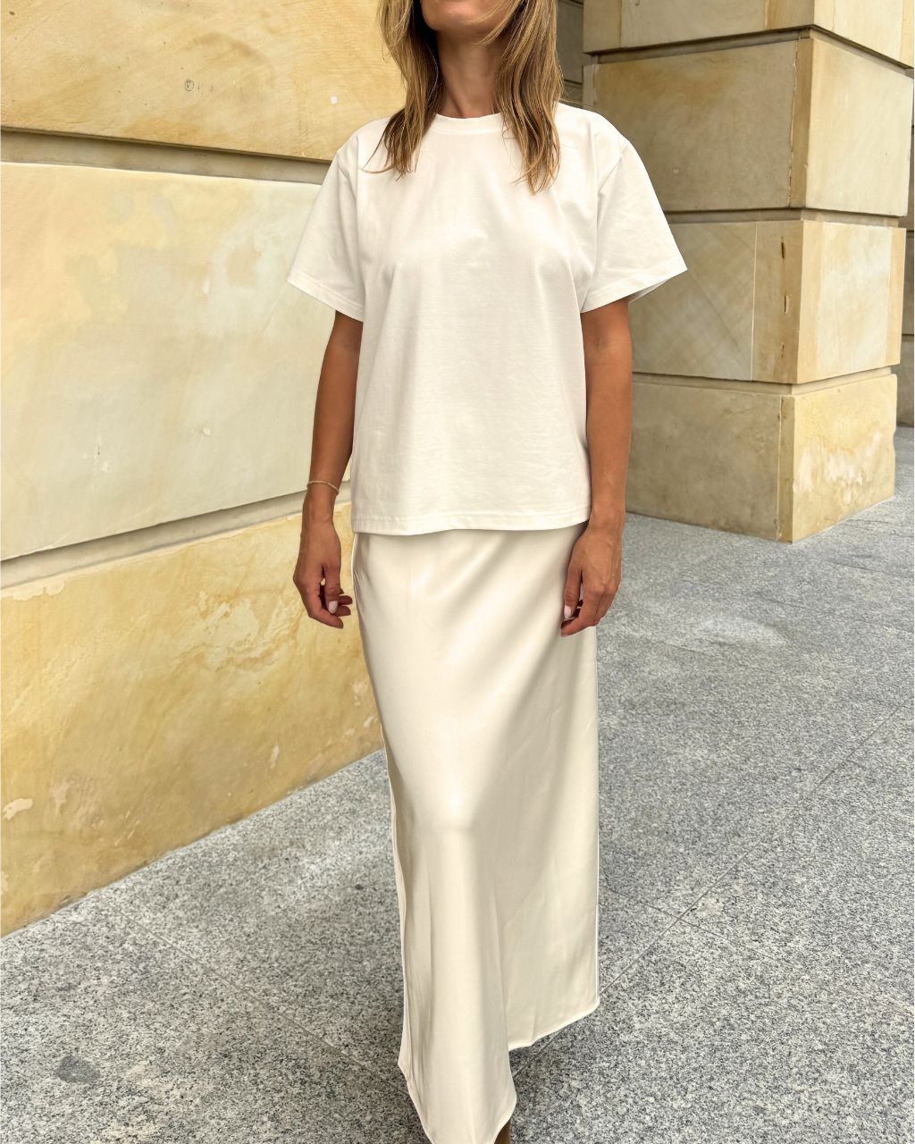 Minimalistyczny t-shirt, który wygląda schludnie i „trzyma formę”. Uszyty z dzianiny o średniej-w-kierunku-grubszej gramaturze — gładkiej w dotyku, miękkiej i sprężystej dzięki elastanowi. Obniżona linia ramion dodaje nowoczesności, ale krój nie wchodzi w typowy oversize — to swobodna, uporządkowana linia na co dzień i „po godzinach”.